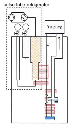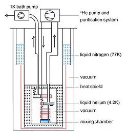 Um refrigerador de diluição 3He/4He é um dispositivo criogênico que proporciona resfriamento contínuo a temperaturas tão baixas quanto 2 mK, sem partes móveis na região de baixa temperatura.[1][2] O poder de resfriamento é fornecido pelo calor de mistura dos isótopos hélio-3 e hélio-4.