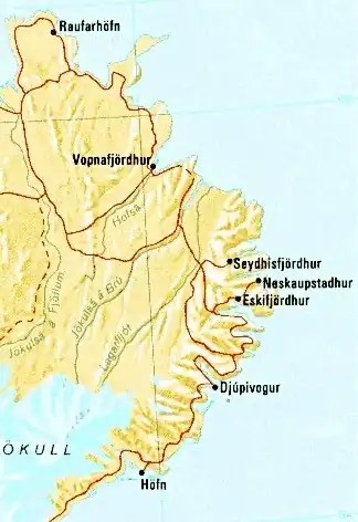 - ↑ a b c Ísberg, Jón Ólafur; Ragnar Th. Sigurðsson (2005). «Östlandet». Island i dag (em sueco). Reiquiavique: Prentleikni ehf. p. 127-138. ISBN 9979-9708-3-9