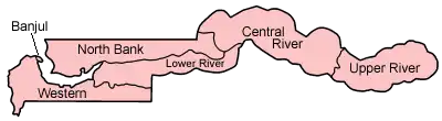 A Gâmbia está dividida em 5 regiões (até 2007 eram conhecidos como "divisões") e uma cidade, a capital Banjul.
