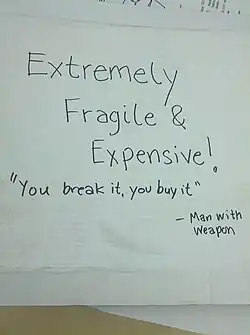 A frase "Se você quebrar, você comprou" foi supostamente usada pela primeira vez em 1952 por uma loja de presentes de Miami Beach, que afixou a mensagem sobre suas mercadorias frágeis.[1]