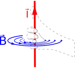 Posicionando-se o dedo polegar da mão direita ao longo de um condutor de forma a orientá-lo com a corrente convencional que circula pelo mesmo também permite a obtenção do sentido de "giro" do campo magnético oriundo desta corrente, bastando para tal acompanhar a orientação dos outros dedos quando estes "abraçam" o fio[Ref. 2] (ver figura).