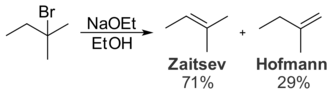 Nas reações de eliminação de E2, uma base abstrai um próton beta a um grupo de saída, como um haleto. A remoção do próton e a perda do grupo de saída ocorrem em uma única etapa combinada para formar uma nova ligação dupla. Quando uma base pequena, sem restrições estéreas - como hidróxido de sódio, metóxido de sódio ou etóxido de sódio - é usada para a eliminação de E2, o produto Zaitsev é normalmente preferido em relação ao alceno menos substituído, conhecido como Produto Hofmann. Por exemplo, o tratamento de 2-bromo-2-metilbutano com etóxido de sódio em etanol produz o produto Zaitsev com seletividade moderada.