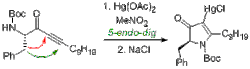 Uma reação de fechamento de anel 5-endo-dig tomóu parte de uma síntese da (+)-Preusina[5]