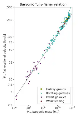 Para galáxias menos brilhantes, ricas em gás a relação não se aplica, mas ao substituir a luminosidade com a massa bariônica do disco temos novamente a relação linear. A relação Tully-Fisher fundamentalmente pode ser uma relação entre velocidade de rotação e massa total bariônica na forma: