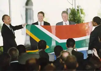 Mandela foi posteriormente eleito presidente da África do Sul, e o vice-presidente dos Estados Unidos, Al Gore, e a primeira-dama Hillary Clinton compareceram à sua posse em Pretória em maio de 1994. Em outubro daquele ano, Mandela voltou a Washington para um jantar oficial oferecido pelo presidente dos Estados Unidos, Bill Clinton .