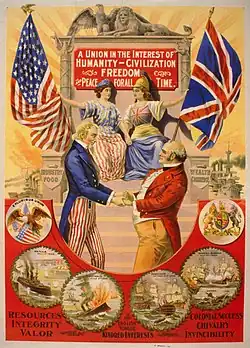 A "Grande Aproximação" foi um período de alinhamento de objetivos sociais e políticos entre Londres e Washington que se estendeu de 1895 até o início da Primeira Guerra Mundial. As duas nações ampliaram suas relações bilaterais após o apoio britânico durante a Guerra Hispano-Americana e a garantia estadunidense de que permitiriam a Independência de Cuba.[17] Em contrapartida, os norte-americanos apoiaram a Grã-Bretanha durante a Guerra dos Bôeres.[18]