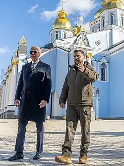 A presidência de Joe Biden adotou uma postura mais intervencionista na Ucrânia e mais rígida em frente a Rússia. Em agosto de 2021, Biden decretou o envio de armamentos a Ucrânia no valor de US$ 60 milhões.[9][10]Biden compareceu em uma reunião em em dezembro de 2021 com o presidente russo Vladimir Putin e tratou de acalmar sua inquietude sobre a expansão da OTAN, argumentando que era pouco provável que a Ucrânia fosse aceita como membro. Putin propôs um tratado de paz com Estados Unidos que pusesse fim à expansão da organização. Biden recusou e optou por acelerar as entregas de armas a Ucrânia e os preparativos para a guerra contra Rússia em solo ucraniano.[11][12]Biden também ameaçou, em fevereiro de 2022, em impor sanções ao gasoduto Nord Stream 2 caso a Rússia invada a Ucrânia.[13][14][15]Por sua vez, a vice-presidente dos Estados Unidos, Kamala Harris, sugeriu a Zelensky que organizasse um governo ucraniano no exílio e um plano de sucessão.[16]