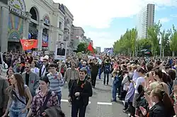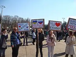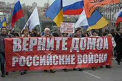 Ao longo de março e abril de 2014, a agitação pró-Rússia se espalhou na Ucrânia, com grupos pró-Rússia proclamando "Repúblicas Populares" nos oblasts de Donetsk e Luhansk, desde então estão ambos parcialmente fora do controle do governo ucraniano.[114]
