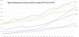 A economia chinesa apresentou um crescimento real anual contínuo do PIB de 5% a 10% desde 1991, de longe a maior taxa do mundo. Começando pobre, tornou-se uma nação rica, com bolsões de pobreza cada vez menores em áreas rurais remotas. Uma migração muito intensa de centenas de milhões de pessoas se mudou das aldeias para as cidades para fornecer força de trabalho. No início de 1992, o líder chinês Deng Xiaoping fez uma série de pronunciamentos políticos com o objetivo de dar um novo impulso e revigorar o processo de reforma econômica. O Congresso Nacional do Partido Comunista apoiou o renovado impulso de Deng por reformas de mercado, afirmando que a principal tarefa na década de 1990 era criar uma "economia de mercado socialista". A continuidade do sistema político, mas uma reforma mais ousada do sistema econômico, foram anunciadas como as marcas registradas do plano de desenvolvimento de 10 anos. O governo de Deng investiu pesadamente na melhoria da infraestrutura de rodovias, metrôs, ferrovias, aeroportos, pontes, represas, aquedutos e outras obras públicas. A China tornou-se a maior fabricante e exportadora do mundo. Problemas importantes, como a poluição e a desigualdade de renda, agravaram-se. Em 2020, o Partido Comunista Chinês, sob o secretário-geral Xi Jinping, estava migrando da indústria para os serviços ao consumidor e a alta tecnologia. Os planejadores esperavam que o crescimento resultante, embora menos rápido, fosse mais sustentável.[56][57]