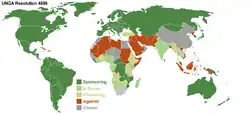 Contra: (25) Afeganistão, Arábia Saudita, Argélia, Bangladesh, Brunei, Cuba, Emirados Árabes Unidos, Iémen, Indonésia, Irão, Iraque, Jordânia, Líbano, Líbia, Malásia, Mali, Mauritânia, Paquistão, Qatar, República Popular Democrática da Coreia, Somália, Sri Lanka, Sudão, Síria e Vietname.