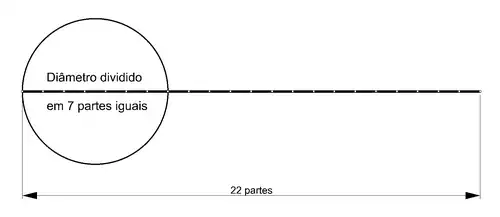 - Ao dividir o comprimento de uma circunferência em vinte e duas partes iguais, o diâmetro dela medirá aproximadamente sete dessas partes.
