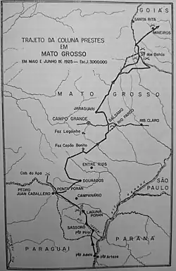 Derrotados no Paraná, os tenentistas reorganizaram sua 1.ª Divisão Revolucionária, mais conhecida como Coluna Prestes, e atravessaram o território paraguaio para reaparecer no Brasil, invadindo Mato Grosso. A divisão tinha cerca de mil homens desgrenhados, com pouca munição e montarias, e encontrou uma abundância de gado e outros recursos no sul mato-grossense. A vanguarda liderada por João Alberto Lins de Barros (2.º RC) atravessou a fronteira em 30 de abril[87] e em 6 de maio teve seu primeiro combate na localidade de Panchita. As forças governistas na região, ao comando do coronel Péricles de Albuquerque, eram cerca de 600 homens, incluindo uma companhia vinda do Rio de Janeiro e outra de Curitiba. Outros destacamentos continuavam a cruzar a fronteira: o 3.º BC de Virgílio dos Santos atravessou Porto Felicidade, no rio Amambaí, em 7 de maio, e o 1.º Batalhão Ferroviário, de Cordeiro de Farias, ocupou o porto Dom Carlos, na margem direita do rio Paraná, no dia seguinte.[88][89]