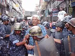 O rei Gyanendra prendeu líderes proeminentes, incluindo o porta-voz do Congresso do Nepal, Arjun Narasingha K.C. – mostrado acima sendo levado para a prisão central.