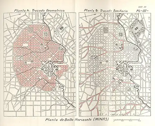 Mesmo antes da inauguração da nova capital de Minas, ao longo de 1896, foram realizadas as primeiras intervenções com a finalidade de retificar o Ribeirão Arrudas na área central da cidade. Naquele ano, o canal de água foi totalmente rebaixado para começar as obras de retificação do leito[8]. Nesse momento, seguiam-se as previsões da planta elaborada pela Comissão Construtora da Nova Capital, como demonstra um detalhe da Planta Geral da cidade, abaixo, o curso d’água teve que se moldar de acordo com o plano geométrico da cidade.
