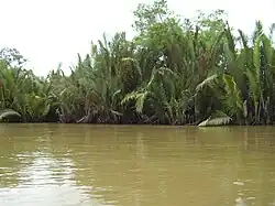 O delta do Mahakam é um delta misto dominado por influências fluviais e de maré. Ele cobre cerca de 1.800 km², composto por áreas de mangue próximo à costa, pântanos de Nypa fruticans nas áreas centrais e floresta de terras baixas perto do ápice, correspondendo à primeira bifurcação.[30] O desenvolvimento pesqueiro nessa área converteu vastas extensões de mangue em viveiros de camarão (tambak). No entanto, esforços recentes de restauração de mangues têm ocorrido no delta, com o replantio de mangues em viveiros abandonados e incentivo à aquicultura integrada de mangue-camarão.[31] Muitas áreas no delta do Mahakam já foram naturalmente recolonizadas por vegetação de mangue, contribuindo para a restauração do ecossistema.[32] Os mangues também funcionam como estratégias de melhoria da sedimentação, capturando sedimentos e promovendo acreção.[33]