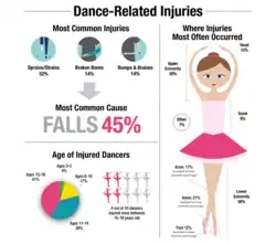 Muitos movimentos de dança, e particularmente técnicas de balé, como o desvio dos quadris e a elevação dos dedos dos pés ( en pointe ), testam os limites da amplitude de movimento do corpo humano. Os movimentos da dança podem sobrecarregar o corpo quando não executados corretamente; mesmo que a forma perfeita seja usada, o excesso de repetição pode causar lesões por esforço repetitivo . As lesões mais comuns em bailarinos são a síndrome do quadril e lesões nos pés e tornozelos.[7] Lesões nos pés e tornozelos são vulneráveis a uma ampla gama de lesões, incluindo fraturas por estresse, lesões nos tendões, entorses e distensões. Muito disso se deve não apenas à ênfase do footwork na dança, mas também ao uso do pé. Os dançarinos usam sapatilhas de ponta, pés descalços, algum tipo de sapato macio ou salto alto, os quais não oferecem suporte. Lesões no ombro podem ser comuns em dançarinos do sexo masculino devido ao trabalho de levantamento, parceria e solo que é comumente visto na dança moderna. Os músculos periescapulares ajudam a manter o ombro imóvel e estável, esses músculos correm maior risco de lesões entre os dançarinos.[8]