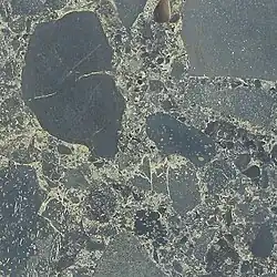- Conglomerados e brechas — rochas onde predominam os clastos com mais de 2,0 mm de diâmetro. Neste grupo estão incluídas as rochas constituídas por seixos, calhaus e outros blocos de maiores dimensões.[6]