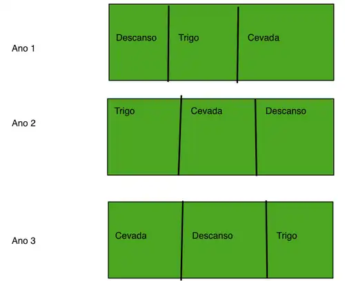 Durante um ano, uma dessas três partes produzia uma determinada cultura (parte nº 2), e uma segunda produzia uma cultura diferente (parte nº 3). A primeira parte ficava em repouso (parte nº 1), isto é, em descanso, de modo a recuperar minerais para um melhor aproveitamento do solo.