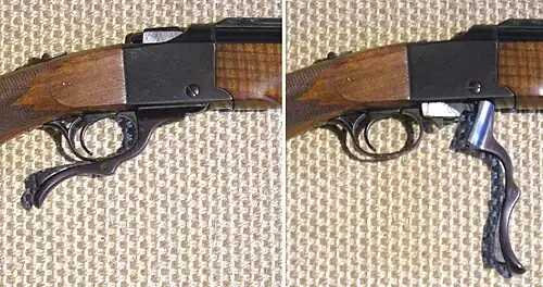 ![]() Um Ruger No. 1 (com a alavanca abaixada para abrir a ação) | |