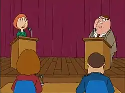 - O discurso inicial de Peter no debate consiste de trechos de músicas-temas de Arnold, One Day at a Time e Vivendo e Aprendendo. Ele conclui com "Sente, Ubu, sente. Bom garoto!", que é do crédito de produção da UBU Productions, Inc., uma empresa de produção do produtor executivo Gary David Goldberg, criador de Caras & Caretas, Spin City, entre outros.