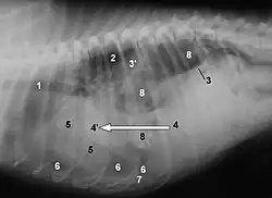 | Uma radiografia mostrando um diafragma elevado à direita[1] | |