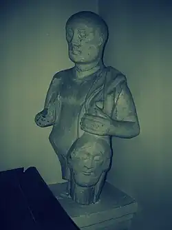 De pedra branca maciça sem qualquer coloração policromada, a primeira imagem, a mais antiga (?), é uma estátua bastante mutilada (ausência dos membros) representando um homem nu esfolado trazendo a pele ao ombro. Lembra o martírio e a flagelação. Na pele, com perfeição, segundo a estética do estilo, é possível distinguir a cabeça. Bem arranjada, cabelos e barba alinhados, trás as pálpebras fechadas em sinal de falta de vida. Uma vez incompleta não nos é possível saber se trazia consigo outros símbolos ou significados. Numa análise comparada, segundo os autores acima identificados, identificamo-la como uma variante da estética dita romana. Curiosamente, com algum assombro contemporâneo, reminiscente da descoberta medieval de imagens ou de encontros milagrosos, mas sem o maravilhoso de outrora, foi achada na abertura de um poço na propriedade do Embaixador Luís Teixeira de Sampayo na primeira metade do séc. XX.