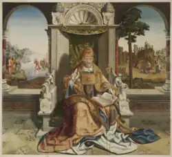 No primeiro plano, verifica-se um traço minucioso e preciso no delinear da figura e do trono de inspiração italiana. Os pormenores sensíveis bem definidos, uma constante em todo o percurso do pintor, evidencia-se na riqueza decorativa da capa em brocado, com inúmeras jóias incrustadas e anjos pintados que seguram os instrumentos da Paixão, no pluvial, nos anéis sobre as luvas, nos elementos decorativos do ladrilhado perspectivamente traçado ou nos putti que decoram os braços do trono.[1]