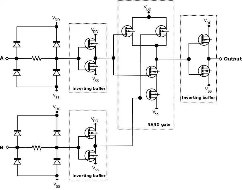 Abaixo, os diagramas mostram as diferenças na construção entre as versão bufferizada e não-bufferizada de uma porta lógica NOR CMOS. É importante notar que, apesar de, ao centro do diagrama estar especificada uma porta NAND, a função completa do circuito é NOR, devido às inversões causadas pelo próprio buffer, afinal, como definido pela lei de DeMorgan da Álgebra Booleana, a inversão de uma NAND com entradas invertidas resulta em uma NOR. Os diodos presetntes no circuito tem como objetivo proteção contra descargas eletrostáticas.