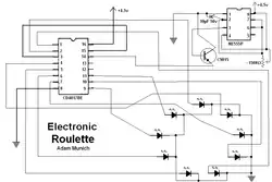 O circuito à direita mostra como criar um jogo de roleta utilizando um contador de década 4017 e vários outros componentes eletrônicos. No esquema, o resistor variável ajusta a velocidade de rotação da roleta.