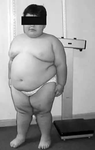 | Criança de oito anos com síndrome de Prader-Willi,[1] mostrando obesidade característica | |