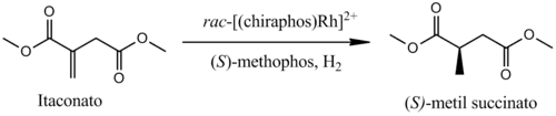 Esquema de reação onde a aplicação de um sistema catalítico racêmico [(chiraspho)Rh]22+ mais (S)-methophos levou a produção de metil-succinato com 49% de ee.