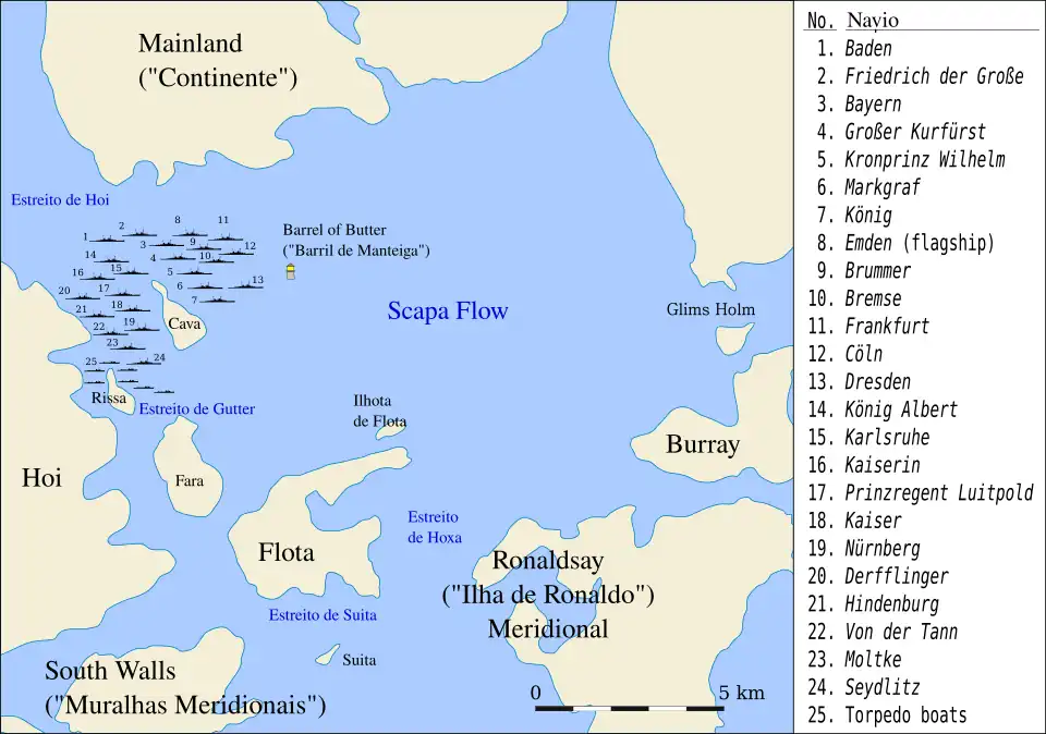 A maior parte da Frota de Alto-Mar, sob o comando do contra-almirante Ludwig von Reuter, que sucedeu Hipper, foi internada na base naval britânica de Scapa Flow na Escócia após a rendição da Alemanha em novembro de 1918.[56] O almirante Adolf von Trotha, Chefe do Estado-Maior da Frota de Alto-Mar, antes da partida alemã, deixou claro para Reuter que ele não poderia, sob qualquer circunstância, permitir que os Aliados tomassem os navios.[58] A frota encontrou-se com o cruzador rápido britânico HMS Cardiff, que os levou até uma frota Aliada que os escoltou até Scapa Flow. A enorme flotilha era formada por aproximadamente 370 navios de guerra britânicos, franceses e norte-americanos.[59] As embarcações alemães, assim que foram internadas, tiveram suas armas desabilitadas através da remoção de seus ferrolhos, com suas tripulações sendo gradualmente reduzidas com o passar dos meses.[60]