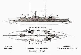 | Armamento | 4 canhões de 305 mm 8 canhões de 240 mm 20 canhões de 100 mm 6 canhões de 66 mm 4 canhões de 47 mm 3 tubos de torpedo de 450 mm |