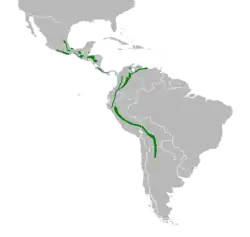 - Encontrado no extremo sudeste da Sierra Madre de Chiapas (Vulcão Tacaná [en]; provavelmente a oeste de El Triunfo) e ao sul, ao longo da encosta do Pacífico das montanhas da América Central, provavelmente até a Nicarágua. Se considerada uma espécie separada, inclui as subespécies honduratius e schistaceiceps.