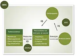 Todo esse sistema privado é regulado por três órgãos. A Agência Nacional de Vigilância Sanitária (ANVISA) é responsável pela regulação sanitária e econômica do mercado de compra e venda de insumos hospitalares; à Agência Nacional de Saúde Suplementar (ANS) cabe regular o fluxo financeiro e de serviços entre operadoras, beneficiários e prestadores; e o Sistema Brasileiro de Defesa da Concorrência (SBDC) deve garantir a competitividade no setor.[2]