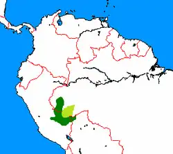 | Distribuição de ambas as subespécies do sagui-imperador; sagui-imperador-barbudo em verde escuro e sagui-imperador-de-queixo-preto em verde mais claro | |