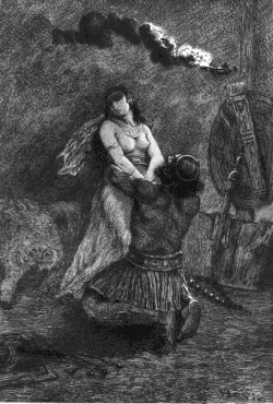 Mâtho cai aos pés de Salammbô, não acreditando na visita inesperada de sua amada.