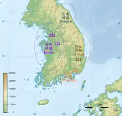 - ↑ Injae, Lee; Miller, Owen; Jinhoon, Park; Hyun-Hae, Yi (2014). Korean History in Maps (em inglês). [S.l.]: Cambridge University Press. p. 18. ISBN 9781107098466. Consultado em 16 de abril de 2019