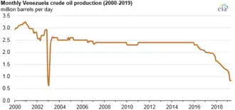 Os Estados Unidos impuseram sanções adicionais à PDVSA em 28 de janeiro de 2019 para pressionar Maduro a renunciar durante a Crise presidencial venezuelana de 2019.[110][111] As sanções impediram a PDVSA de receber pagamentos por exportações de petróleo para os Estados Unidos, congelaram 7 bilhões de dólares em ativos da PDVSA nos EUA e impediram empresas norte-americanas de exportar nafta para a Venezuela. Bolton estimou a perda esperada para a economia venezuelana em mais de 11 bilhões de dólares em 2019.[110][112]