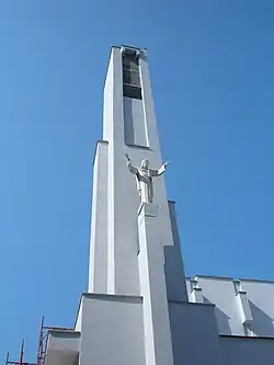 A igreja fica numa posição elevada em relação à praça em frente e é acessível através de uma escada localizada à esquerda da fachada. Totalmente construída em concreto armado aparente em estilo brutalista, a igreja é flanqueada por uma alta torre campanária. Na frente dele está um pilar no alto do qual uma estátua de Cristo com os braços abertos.