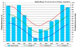 Santa Rosa encontra-se a leste da província de La Pampa, da qual é capital. O clima é clima temperado pampeano com média de 24 graus Celsius em janeiro com máximas absolutas de quarenta graus Celsius. Em julho, a média é de sete graus Celsius.
