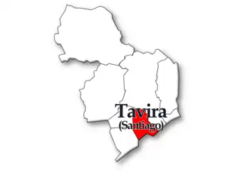 Brasão: escudo de azul, castelo de ouro aberto e frestado de negro, carregado com uma cruz da Ordem de Santiago de vermelho e tendo na torre do meio uma bandeira de ouro, fretada de vermelho, com haste de negro; em orla, um ramo de alfarrobeira e um de amendoeira, floridos e frutados de prata, com os pés passados em aspa e atados de vermelho. Coroa mural de prata de três torres. Listel branco, com a legenda a negro: “TAVIRA - SANTIAGO”.
