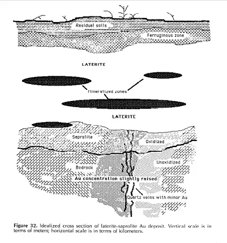 Nos rególitos lateríticos, entendendo-se os rególitos como a camada solta de rochas que recobre sobre o leito rochoso, o saprólito pode ser recoberto por camadas superiores de laterite residual, mas a maior parte do perfil original é preservada por solos residuais ou por recobrimento por materiais carreados pelos processos da erosão e deposição.[4]