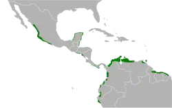 Pode ser encontrada nos seguintes países: Belize, Colômbia, Costa Rica, Equador, El Salvador, Guiana Francesa, Guiana, Honduras, México, Nicarágua, Panamá, Peru, Suriname, Trinidad e Tobago e Venezuela.
