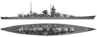 Sua bateria principal consistia em nove canhões SK C/34 calibre 54,5 de 283 milímetros montados em três torres de artilharia triplas, duas à vante da superestrutura e uma à ré. Seu armamento secundário tinha doze canhões SK C/28 calibre 55 de 149 milímetros instalados em quatro torres de artilharia duplas e em quatro montagens únicas. O armamento antiaéreo era composto por catorze canhões SK C/33 calibre 65 de 105 milímetros, dezesseis canhões SK C/30 calibre 83 de 37 milímetros e dez canhões C/30 de 20 milímetros, mas o número total destes depois cresceu para 38. Foi equipado em 1942 com seis tubos de torpedo de 533 milímetros. Seu cinturão principal de blindagem tinha de 150 a 350 milímetros de espessura, enquanto o convés blindado tinha entre cinquenta e 105 milímetros. As torres de artilharia principais eram protegidas por blindagem de 150 a 360 milímetros, ficando em cima de barbetas de duzentos a 350 milímetros. A torre de comando tinha laterais de 350 milímetros e teto de duzentos milímetros.[2]