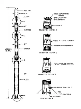 - O primeiro estágio, o motor Algol de 1 m de diâmetro, seria uma combinação das tecnologias dos motores Jupiter Senior e Polaris, produzidos pela Chemical Systems Division (CSD), hoje incorporada pela United Technologies Corporation;