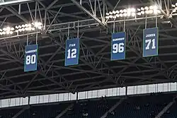 Antes do início de cada jogo em casa, os Seahawks saúdam seus torcedores levantando uma bandeira gigante com o número 12 na extremidade sul do estádio.[67] Jogadores atuais e antigos, treinadores, celebridades locais, fãs proeminentes, atletas da área de Seattle e o atual proprietário, Paul Allen, ergueram a bandeira. Mais cedo, os Seahawks aposentaram a camisa 12 em 15 de dezembro de 1984 como uma homenagem aos seus fãs. Antes da vitória no Super Bowl, os Seahawks correram para o campo sob uma gigantesca bandeira do 12º Homem.