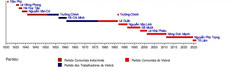 De 2 de setembro de 1969 até sua morte em 10 de julho de 1986, Lê Duẩn foi o líder indiscutível do Vietnã. [13] Ele morreu dois meses antes do próximo Congresso Nacional do Partido. Ele foi sucedido por Trường Chinh, o ex-secretário-geral que serviu como o segundo político mais poderoso do Vietnã desde a morte de Hồ Chí Minh. Trường Chinh foi rebaixado de seu cargo no 6º Congresso Nacional do Partido e foi sucedido por Nguyễn Văn Linh. [14] A imprensa ocidental chamou Nguyễn Văn Linh de "Gorbachev do Vietnã" devido às suas políticas reformistas. [15] Ele renunciou devido a problemas de saúde em 1991, e Đỗ Mười foi nomeado secretário-geral pelo 7º Congresso Nacional. [16] Ele governou até 1997, quando foi afastado do poder pela ala reformista do partido. [17] Lê Khả Phiêu foi o sucessor de Đỗ Mười e foi eleito candidato de compromisso. [18] Ele foi deposto em 2001, antes do 10º Congresso Nacional do Partido, quando o Comitê Central anulou uma decisão do Politburo; a maioria no Comitê Central votou para remover Lê Khả Phiêu como secretário-geral. [19] Nông Đức Mạnh o sucedeu e passou a ser considerado um modernizador. Nông Đức Mạnh também foi o primeiro secretário-geral com diploma universitário. [20] Ele se aposentou em 2011 e foi sucedido por Nguyễn Phú Trọng, que governou por treze anos antes de sua morte. Após sua morte em 2024, Tô Lâm sucedeu Trọng.