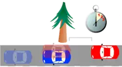 ![]() A regra dos dois segundos diz ao motorista defensivo a distância mínima para evitar colisões em condições ideais de direção. O motorista do carro vermelho escolhe uma árvore para avaliar um atraso de segurança de dois segundos. | |