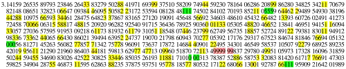 Os primeiros 1.001 dígitos de π (1.000 dígitos decimais), mostrando execuções consecutivas de três ou mais dígitos, incluindo os seis nove consecutivos sublinhados, são os seguintes:[8]